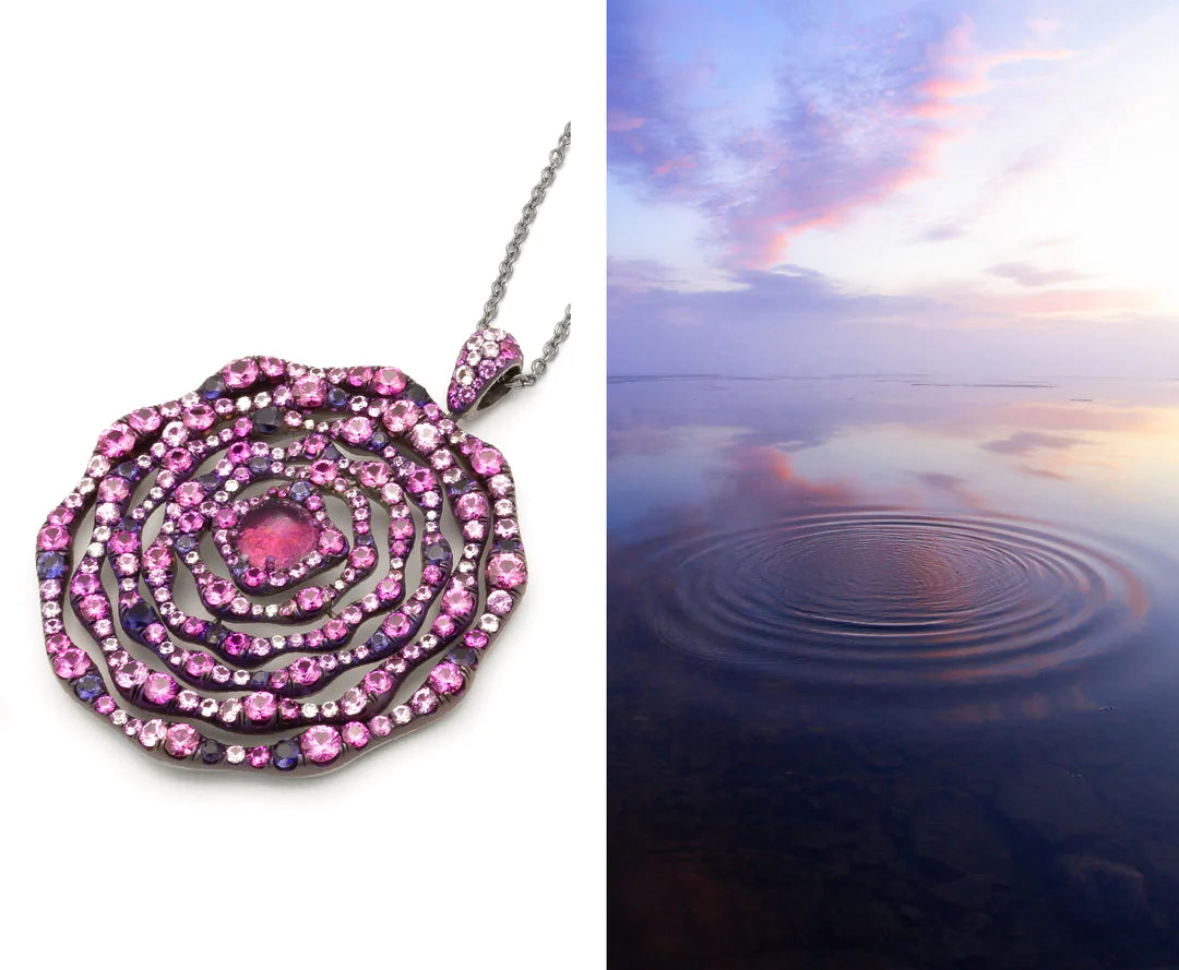 Aqua is a work of art, with its unique pattern of circles that evokes the beauty and mystery of the ocean. Sapphires, white diamonds and iolites are embedded with the utmost precision and care, to recreate the same vibrant effect and colors of ripples in the water.