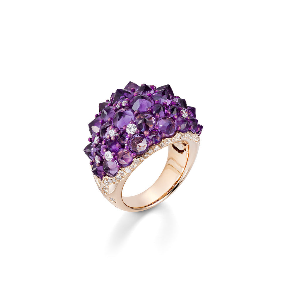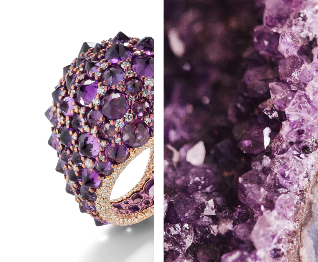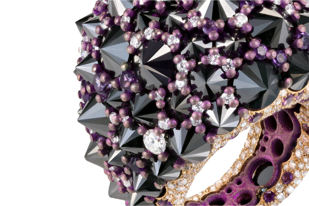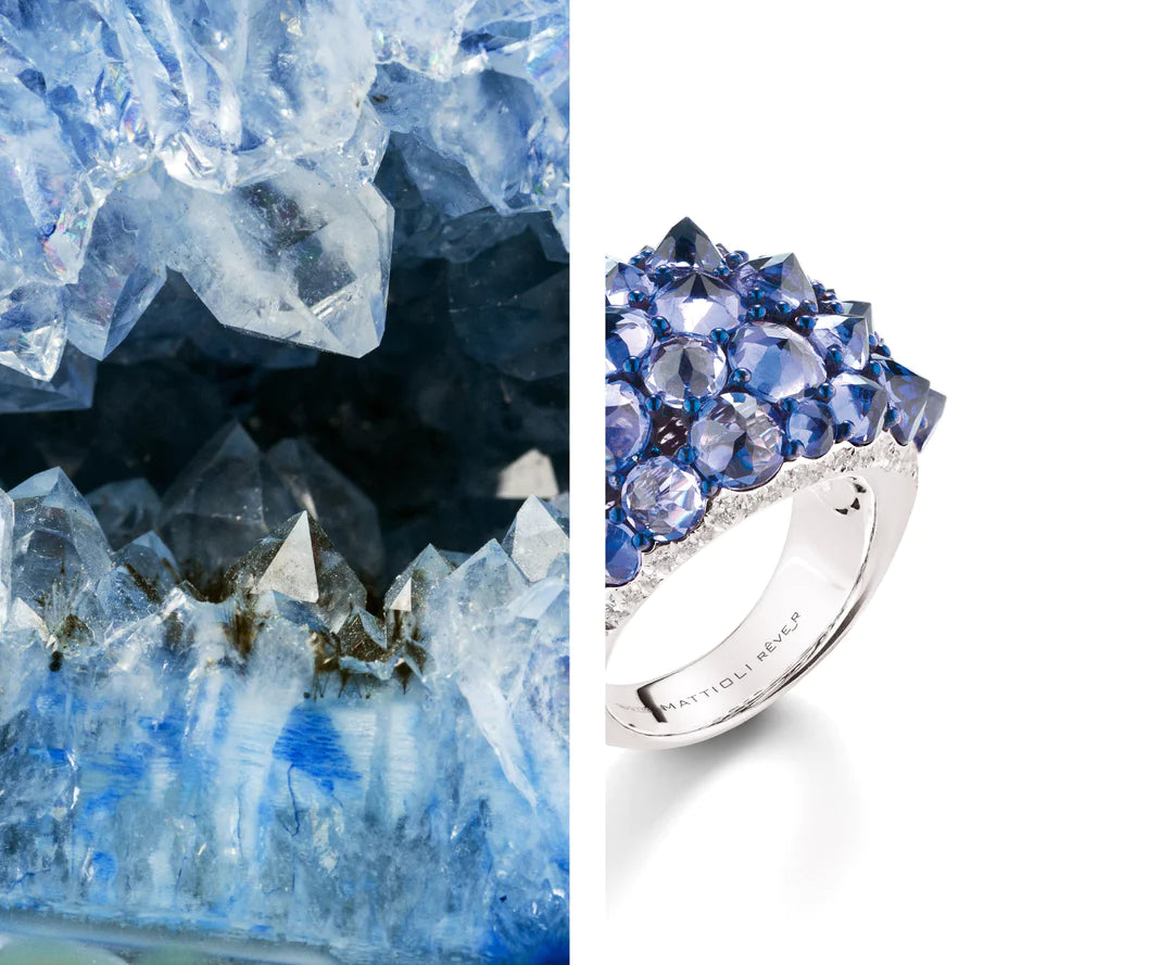 A glittering cascade of diamonds, rubies and tanzanites are combined with shimmering sapphires and sparkling tzavorites. Each stone is cleverly cut and embedded in reverse, creating an edgy and spiky effect on rings and earrings.