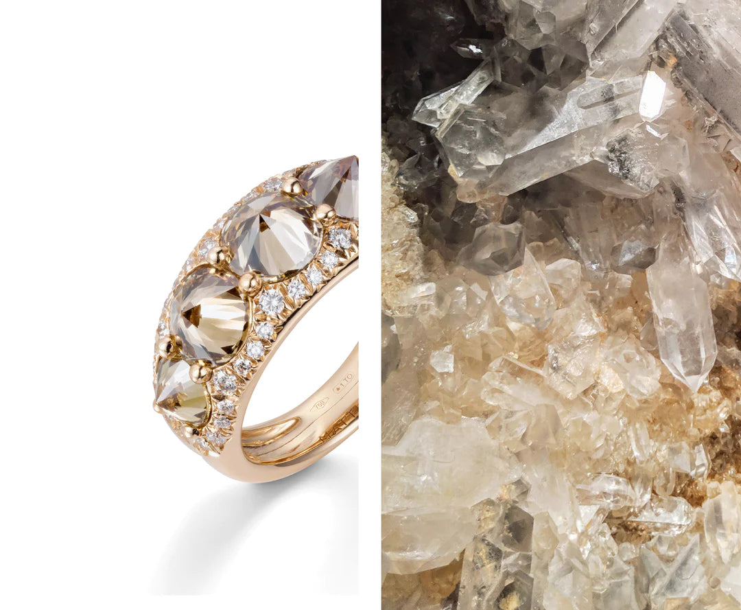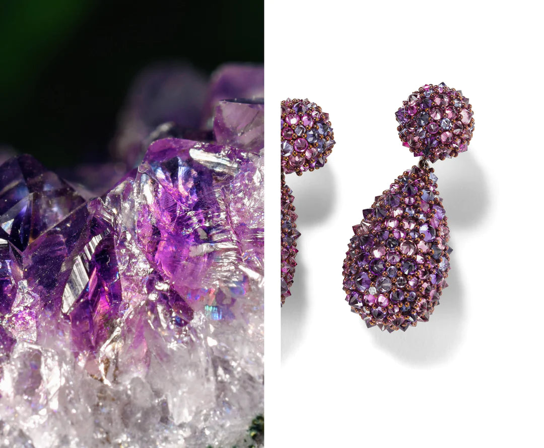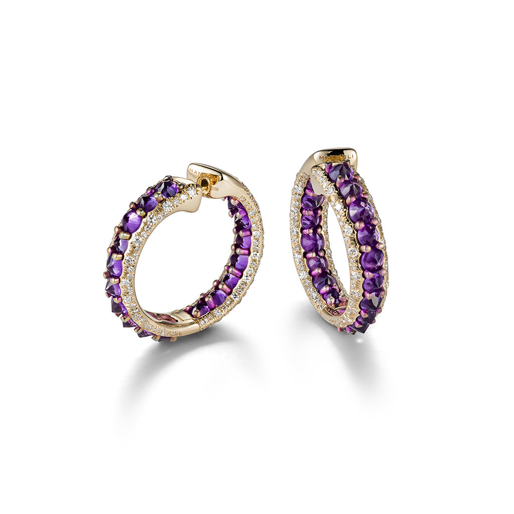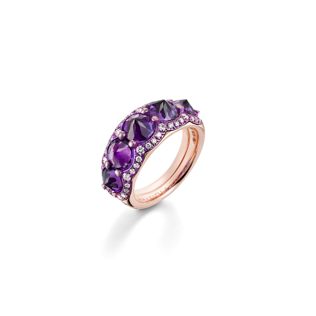 A glittering cascade of diamonds, rubies and tanzanites are combined with shimmering sapphires and sparkling tzavorites. Each stone is cleverly cut and embedded in reverse, creating an edgy and spiky effect on rings and earrings.