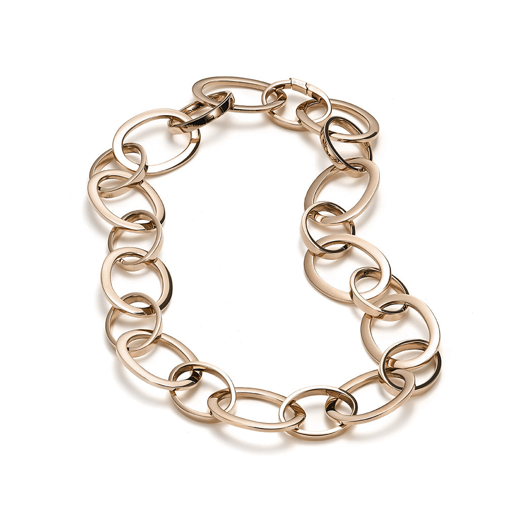 Rose gold takes shape in the elegant Aruba collection. Each piece is an ode to lightness, making even the voids precious with its beautiful proportions and clean form. Crafted with meticulous attention to detail, every item in this collection embodies the vibrant spirit and natural beauty of Aruba. Inspired by the sun-kissed island, Aruba derives from "Oro Hubo," meaning "here there is gold." Aruba necklaces in 18k rose gold feature links of two different sizes that alternate, creating a dynamic and captivating effect.