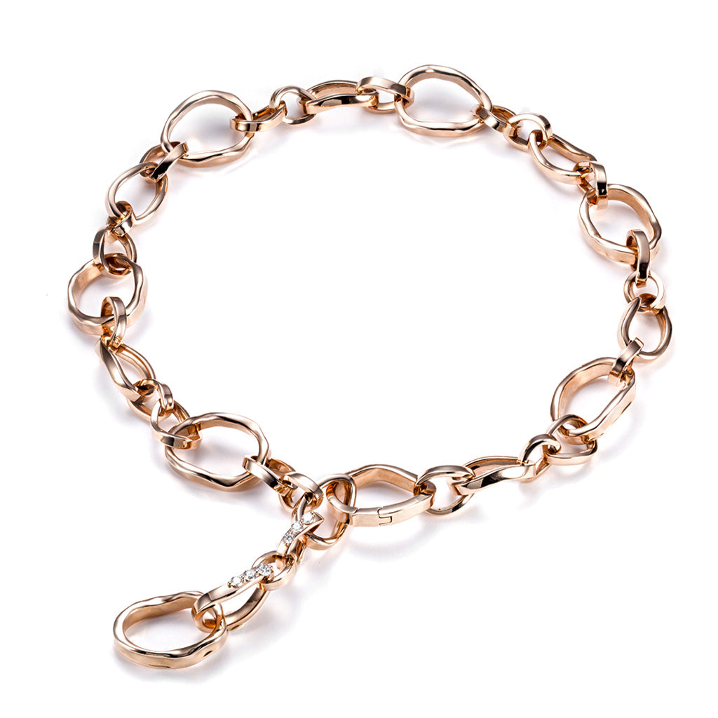 Discover the timeless design of the necklaces from the Aspis collection by Mattioli. Crafted in precious 18k rose gold, Aspis necklaces showcase the brand's craftsmanship, embodying the excellence of Italian jewelry tradition. The links, entirely crafted in hollow tube and hand-hammered, are inspired by the sinuous movements of snakes on the sand, combining extraordinary fluidity and lightness. Alternating between two different sizes, these links create a unique and fascinating visual effect, capturing light and adding depth to the design. The clasp system seamlessly blends into the curves of the chain links, allowing the necklace to be worn as both a choker and a collar necklace.