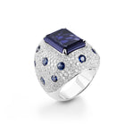 Ring in white gold, white diamonds, iolite and blue sapphires