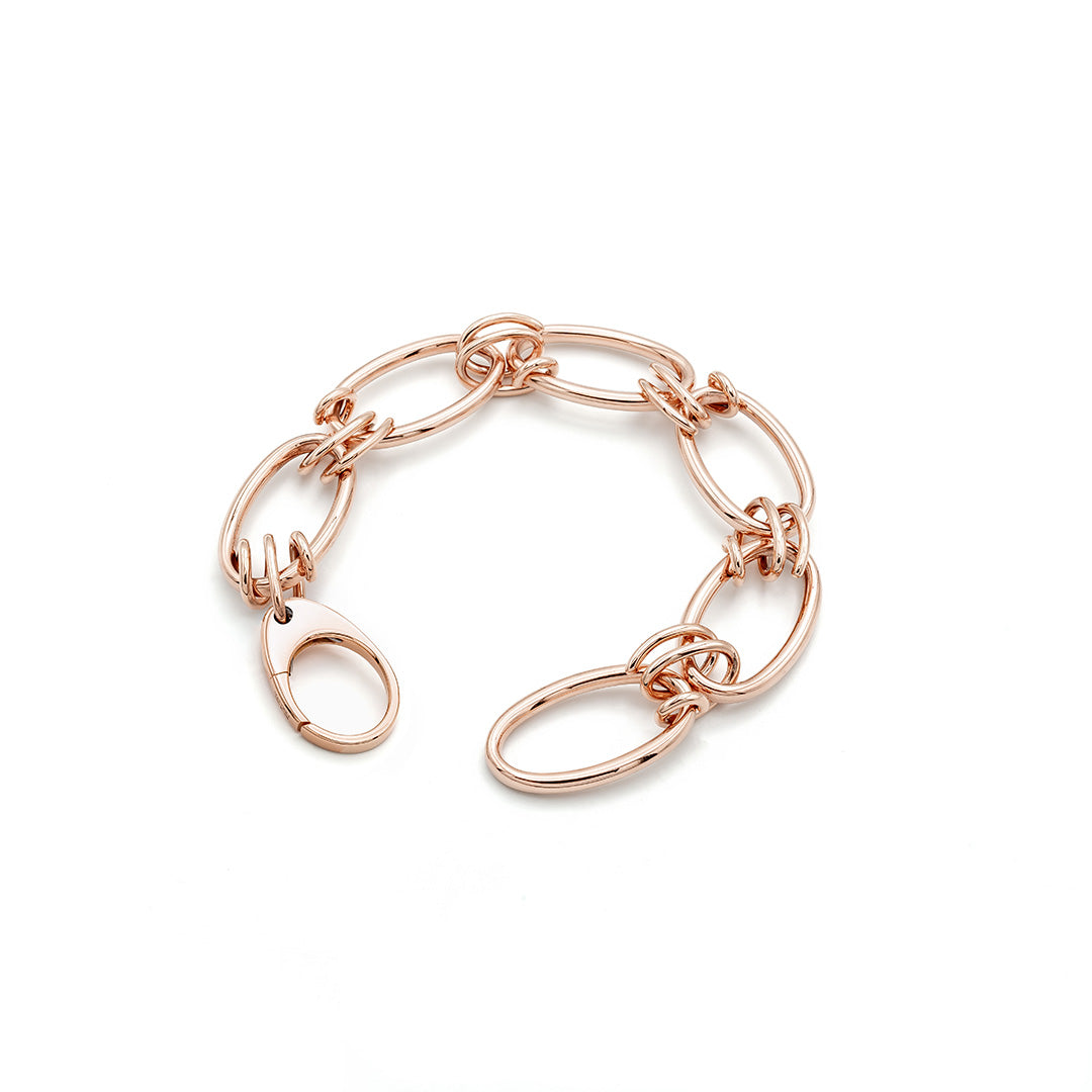 Inspired by the delicate forms of Japanese sakura flowers, the bracelets from Mattioli's Hiroko collection are entirely handmade in elegant 18k rose gold. Choose from chain models and cuffs bracelets, with or without white diamonds. Each Hiroko bracelet features refined oval links in gold, weaving in a continuous alternation of solids and voids, shaping the lightness that inspired all creations in the collection. Perfect for creating ever-changing looks, all Hiroko bracelets can be paired with necklaces from the same collection to extend their length and play with modern and versatile layering.