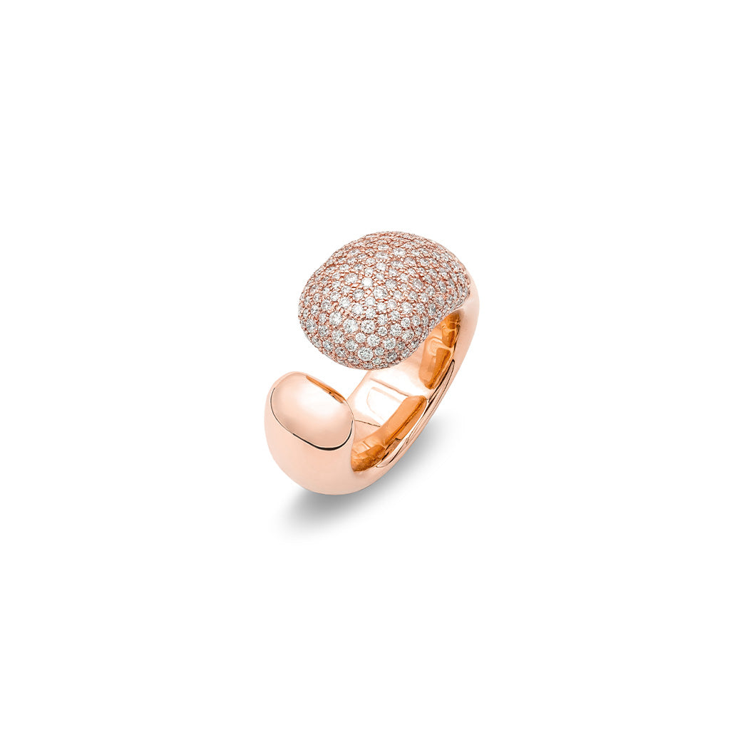 The rings from the Hiroko collection by Mattioli celebrate the essence of beauty and elegance through delicate, harmonious shapes, embellished with refined pavé of white and brown diamonds. Inspired by Japanese sakura flowers, symbol of ephemeral beauty and rebirth, the Hiroko rings are entirely handcrafted in Italy from a delicate 18k rose gold, a signature of the Turin atelier’s craftsmanship. Rounded and convex shapes alternate with ultra-light minimalist models, creating a play of solids and voids enhanced by the carefully set precious stones by Mattioli's goldsmiths.