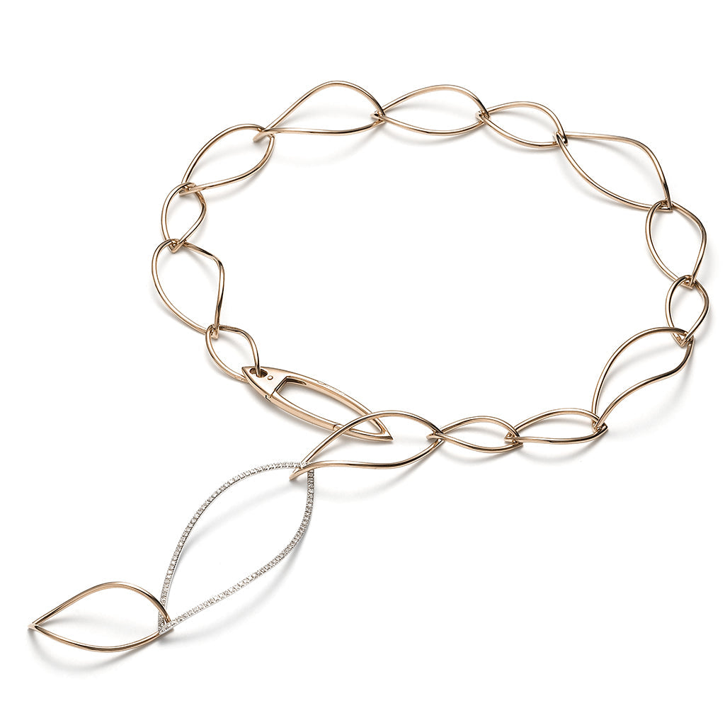 The timeless shape of the navette cut of precious stones is elegantly reinterpreted in long 18k rose gold chains. These refined creations belong to Mattioli's heritage and showcase a savoir-faire rooted in the finest Italian goldsmith tradition. The necklaces in the Navettes collection feature delicate rose gold links, creating a play of fluid and versatile lengths. Thanks to the clasps, the necklaces can be worn in different ways, adapting them to various outfits.