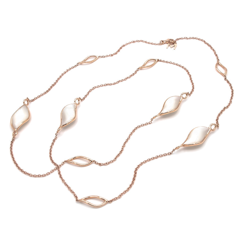 The Navettes sautoir necklaces by Mattioli combine the delicate shades of 18k rose gold, a hallmark of the brand's creations, with the iridescent nuances of natural mother of pearl, carved into elongated shapes inspired by the famous navette cut of gemstones. Each sautoir necklace is meticulously crafted in Italy through the expertise of Mattioli's goldsmiths. Models featuring natural mother of pearl alternate with those in rose gold and white diamonds, perfect for wearing alone or in combination to create overlapping effects and play with lengths.
