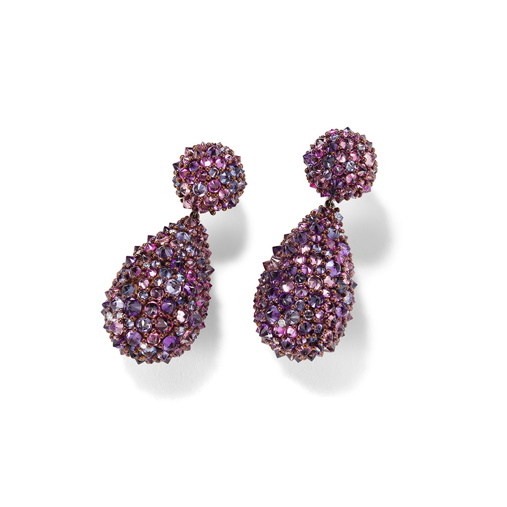 Reve_r earrings in 18k white gold, titanium, white diamonds, sapphires, amethysts, iolites, rhodolites and tourmalines.